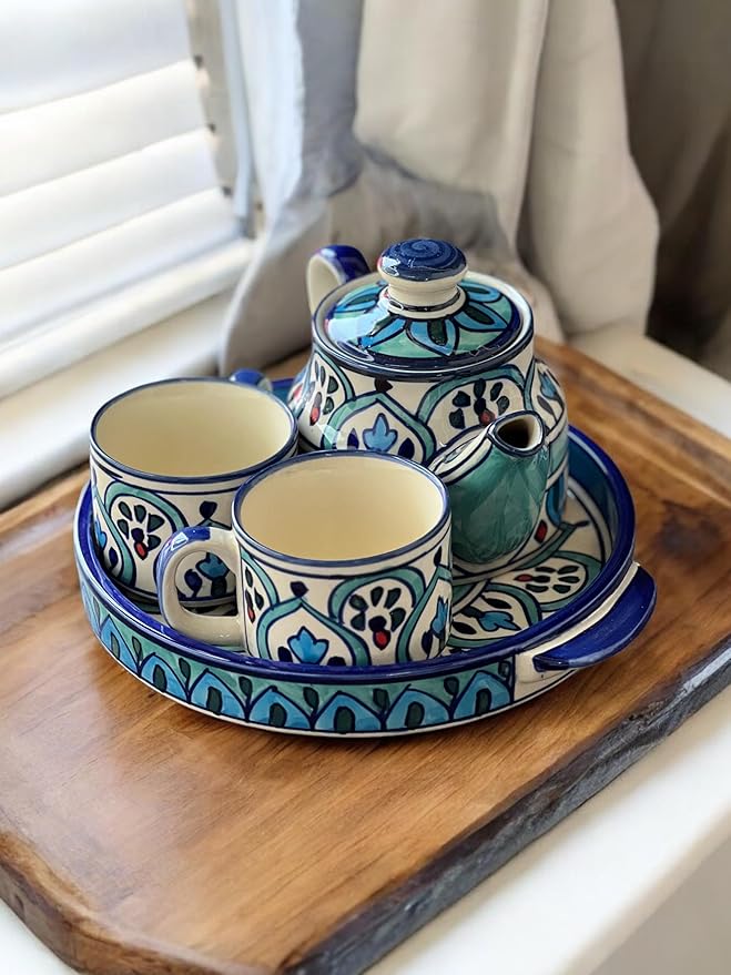 Hand Painted Off White - Blue Ceramic 6 Pieces Tea Pot With Cups and Tray Set